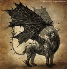 mantícora es una criatura mitológica, era un tipo de "Quimera" con cabeza de león (frecuentemente con cuernos), el cuerpo rojo (en ocasiones de un león), y la cola de un dragón o escorpión, capaz de disparar espinas venenosas para incapacitar o matar a sus presas. Dependiendo del relato mitológico, su tamaño varía desde el de un león hasta el de un caballo, y su descripción puede incluir o no la presencia de alas y coraza.